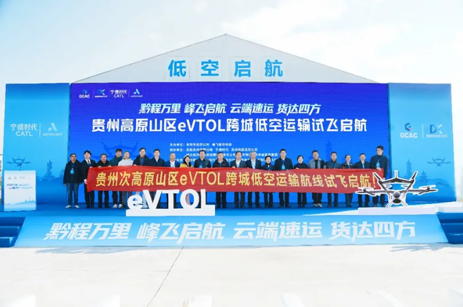 11月20日,由京東物流、峰飛航空、寧德時(shí)代、貴州民航低空經(jīng)濟(jì)發(fā)展有限公司、貴陽(yáng)市低空產(chǎn)業(yè)發(fā)展有限公司、貴州省醫(yī)藥集團(tuán)等多方聯(lián)合打造的2噸級(jí)eVTOL貴州高原山區(qū)跨城物流低空航線完成首次試飛。